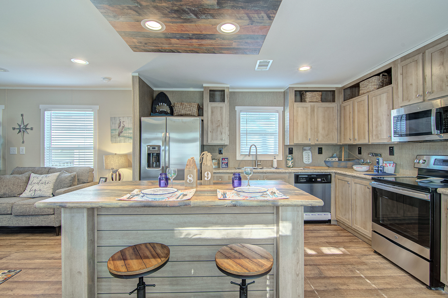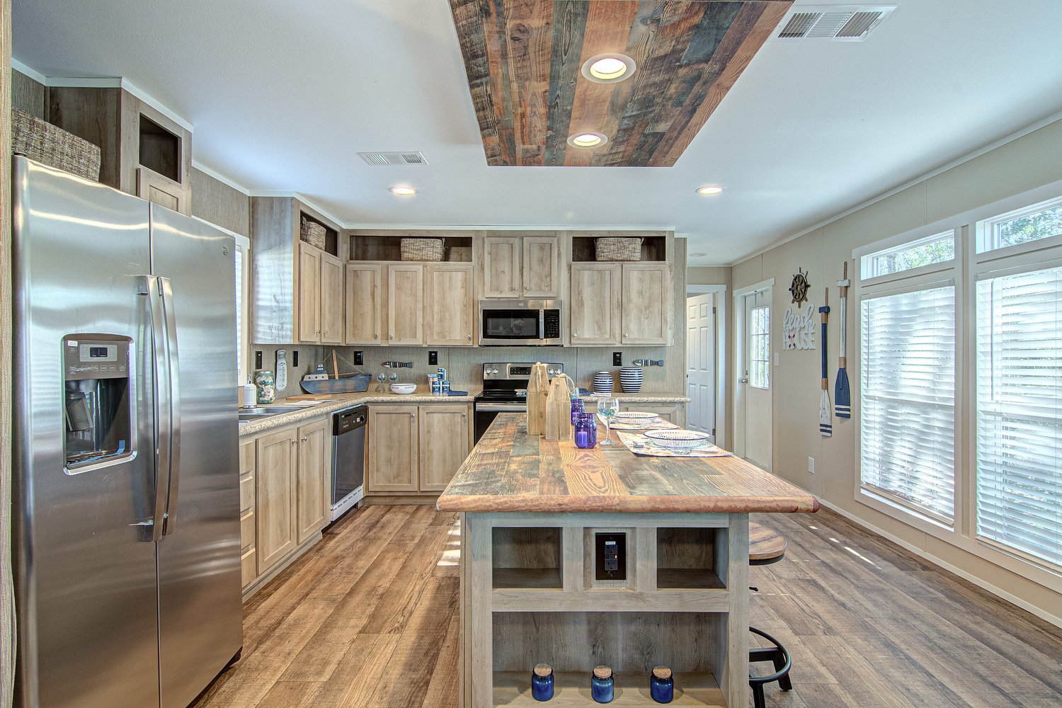We have new pictures to share of our newest model in our Top-Selling Home Line! The Silver Spur 358 is a 3 bedroom, 2 bath, 1178 square foot single wide manufactured home. This new Silver Spur model has solarium windows which flood the open concept living space with lots of light. There’s also a newly redesigned kitchen with island and a huge utility room with freezer space! It also comes with GE Stainless Steel Appliances. The primary bedroom is situated privately from the other two secondary bedrooms. Rest assured, the Silver Spur 358 still has the same great features as the original Silver Spur. There are lots of cabinets, LED lighting, a built-in entertainment center with storage cubbies, and a huge soaking tub.