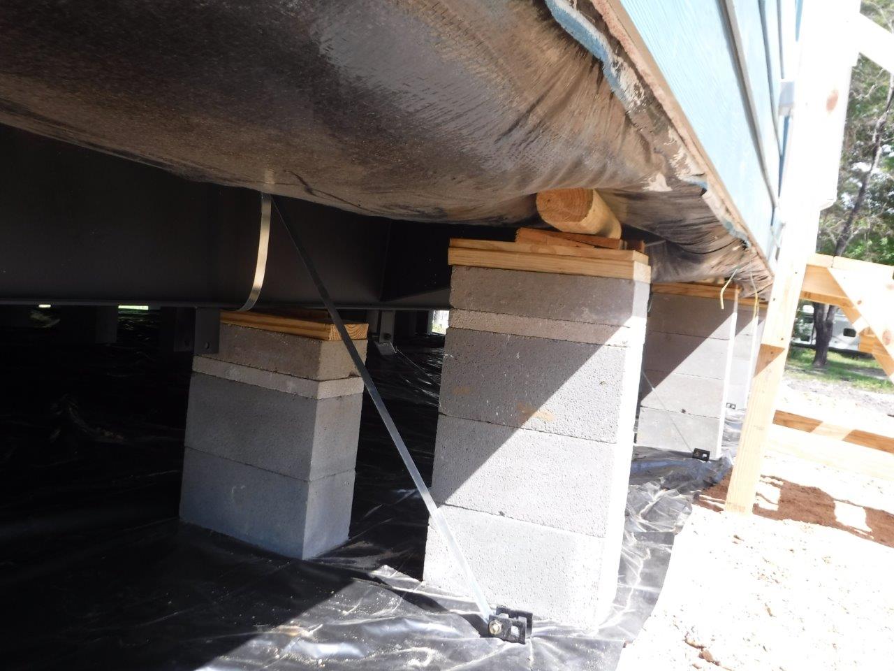 A 47-point inspection ensures all Oak Creek Homes are tied down securely (like the illustration above) near the I-beams with stabilizer plates and ground anchors.