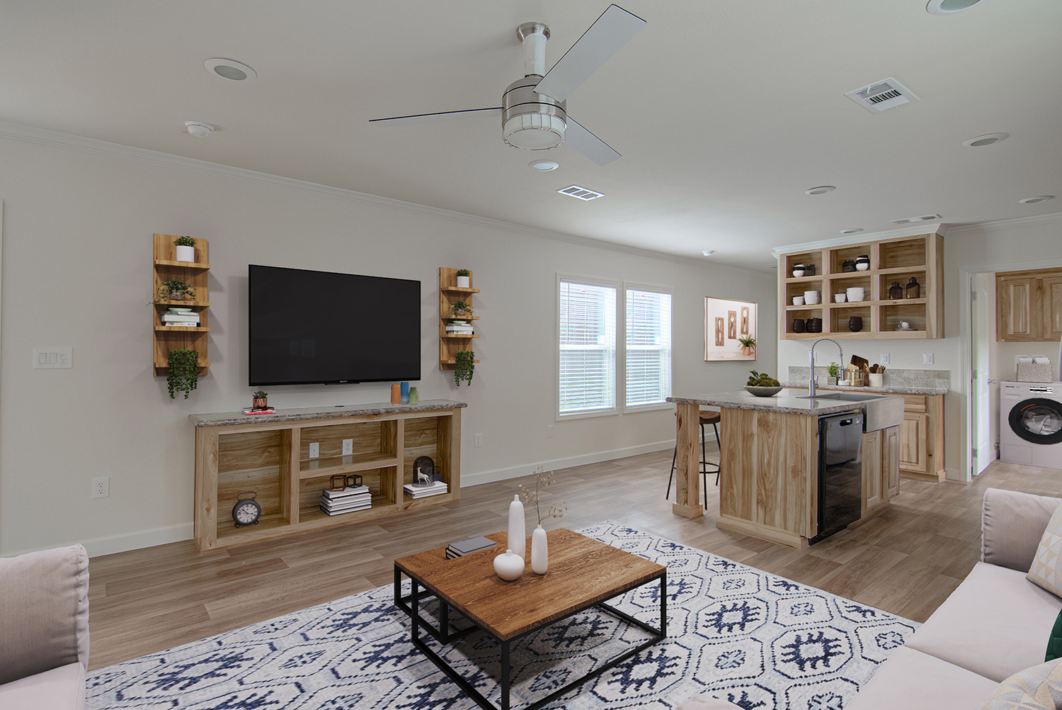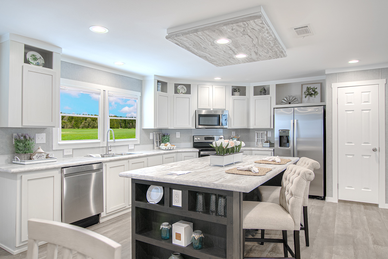 At Oak Creek Homes, we believe that luxury should be accessible to all. Our manufactured homes feature meticulous craftsmanship and attention to detail, bringing affordable luxury within reach. From elegant finishes to modern amenities, we create spaces that elevate your living experience, providing the perfect blend of opulence and practicality. Standard affordable luxury features can include kitchen sharing islands, walk-in pantries, beverage bars, built-in entertainment centers, spacious walk-in tile showers, soaker tubs, walk-in closets, built-in desks, mudrooms, and covered porches, just to name a few.