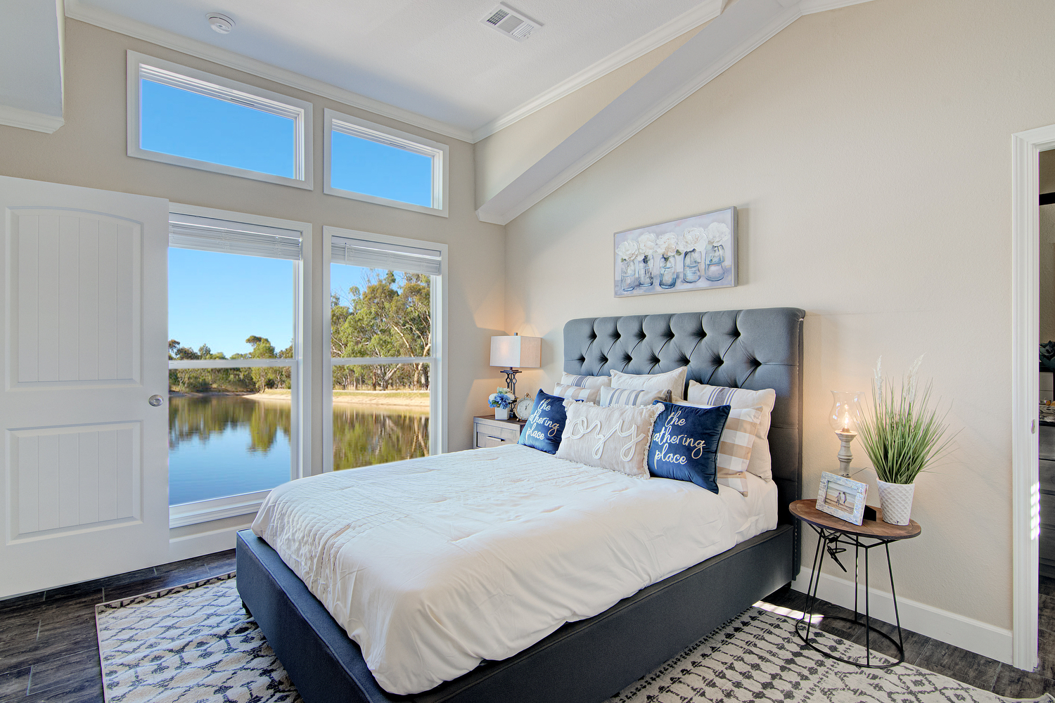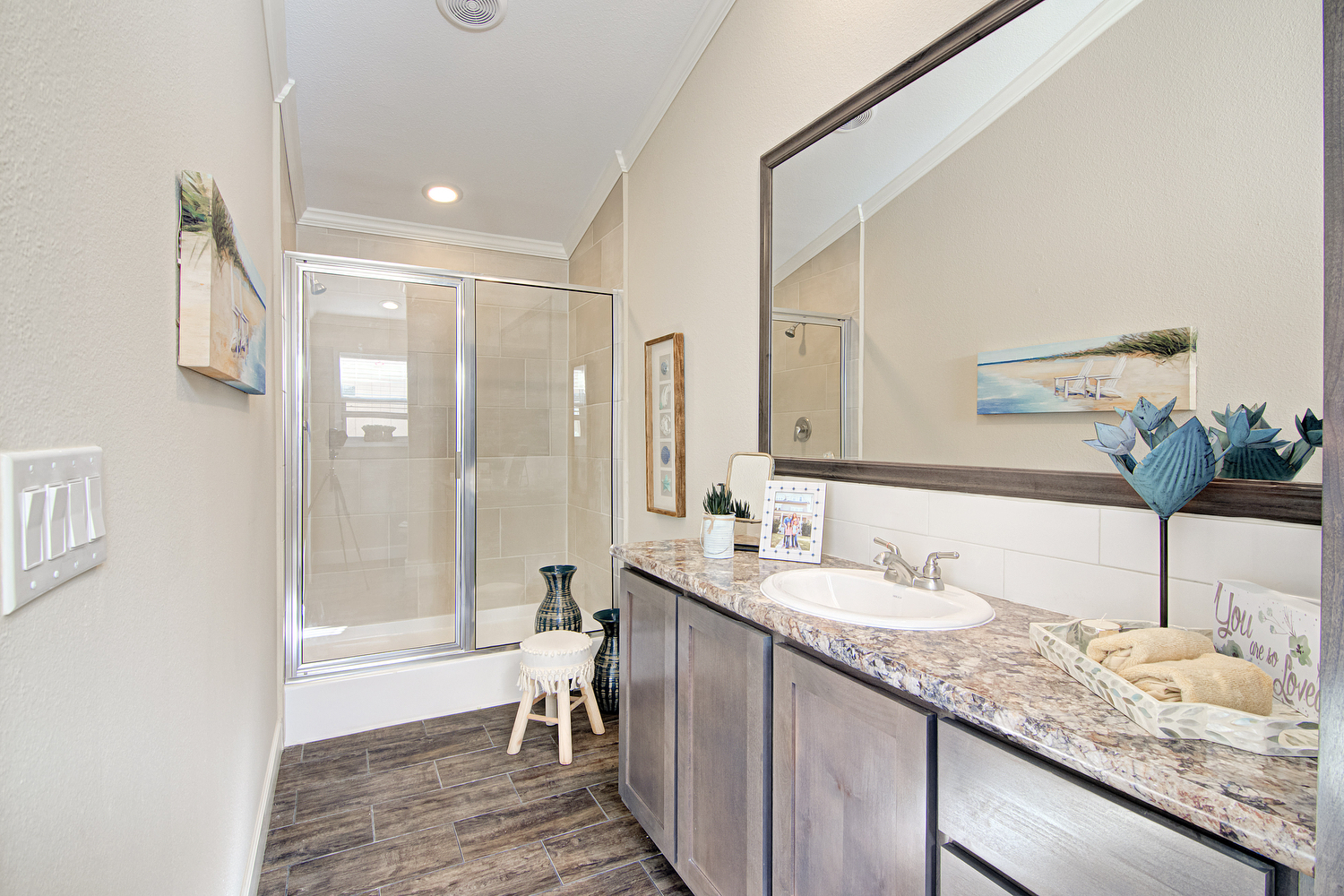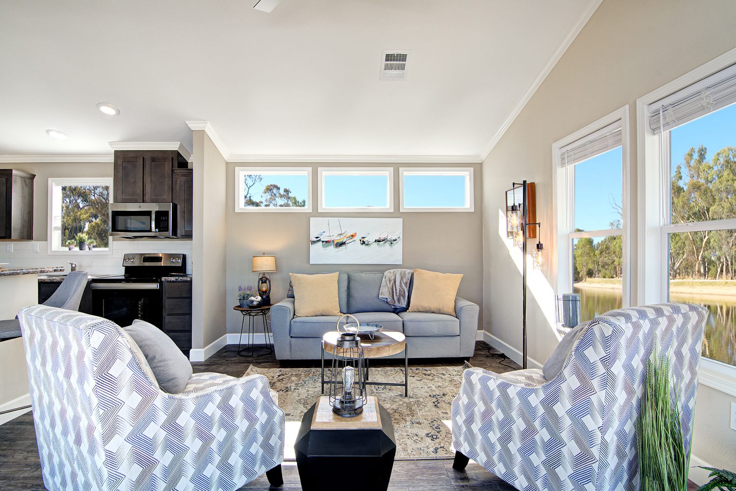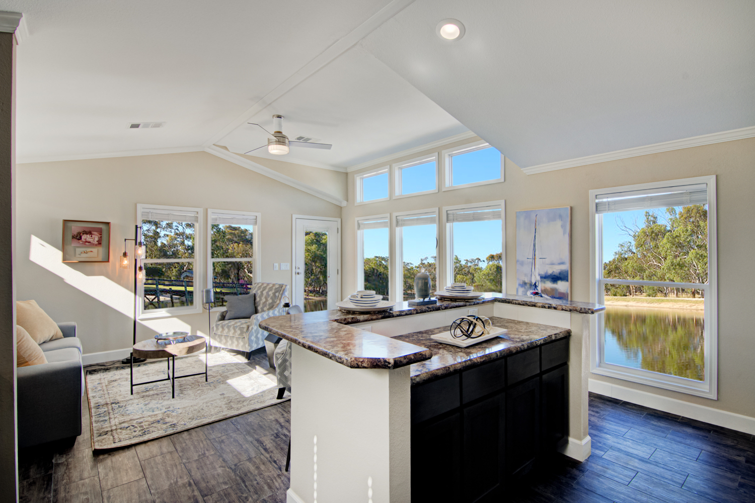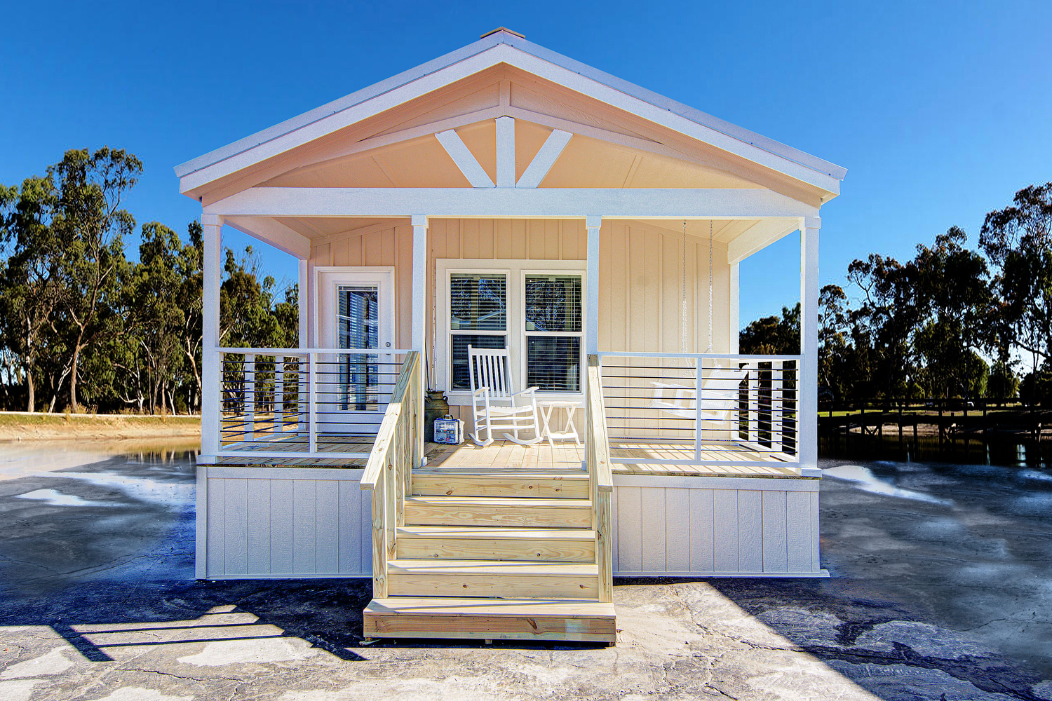 Reel-In the first professional pictures of Smart Cottage Eagle! We’re showing off our biggest 18′ single wide model with a lakeside view! The Eagle features 2 bedrooms, 2 bathrooms, and 980 square feet of luxurious tiny life living. Great not just for the lake, but beach or ranch living, as a guest house, and downsizing too. This particular manufactured model home is decked out with smokey madison shaker cabinets, a logic bone ceramic tile backsplash, and winter carnival countertops with a crescent edge. This is just one design setup you can choose. Many other design choices are available.